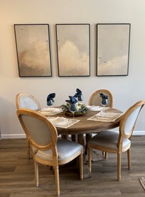 I selected a round table with a modern wood finish, but old-school design - again simple elegance. Although a rug might be nice here; it would break the flow from the kitchen to the great room area and the new floors are beautiful and easy to clean.